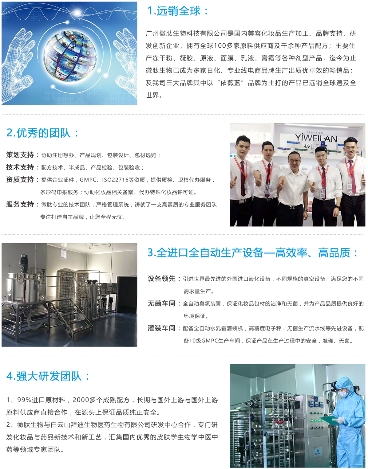 是護膚類產品、面膜類產品、身體類產品、微商化妝品加工、OEM化妝品加工,ODM化妝品加工,網購化妝品加工等產品專業生產加工的公司,擁有完整、科學的質量管理體系,是集化妝品研制開發、生產制造、技術服務、OEM/ODM品牌加工四位一體化的專業工廠,2016年微肽生物更是通過了歐盟ISO22716和美國GMPC雙重認證。工廠坐落在環境幽雅、交通便捷、物流發達的白云區石井街大朗十五社工業區。